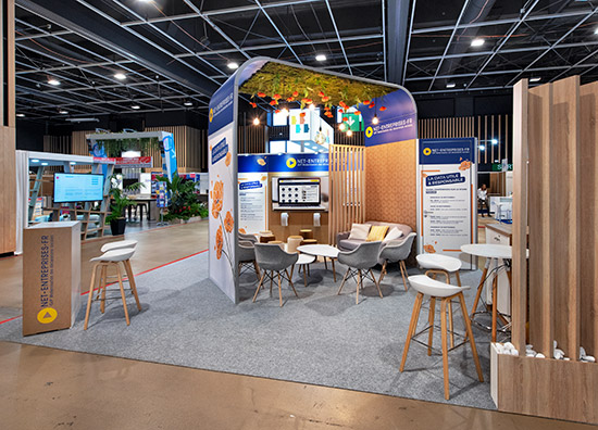Votre stand, votre identite. Nous creons des espaces d'exposition uniques, entierement personnalises selon votre image de marque.